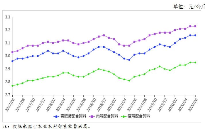 根據農業部數據顯示,6月份育肥豬、肉雞、蛋雞配合飼料月均價分別為每公斤3.16元、3.23元、2.95元,環比分別持平、持平、持平,同比分別漲5.0%、3.9%、3.9%。從周數據來看,到6月第3周,集貿市場價格分別為每公斤3.16元、3.23元、2.95元,為2015年11月以來的較高價格。