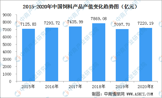 2019年,全國飼料工業總產值8088.1億元,同比下降9.0%。其中,飼料產品產值7097.7億元,同比下降9.8%;飼料添加劑產品產值839.3億元,同比下降12.4%;飼料機械總營業收入60.5億元,同比下降19.3%;寵物飼料產品營業收入97.6億元。預計到2020年末,全國飼料產品產值將超7200億元。
